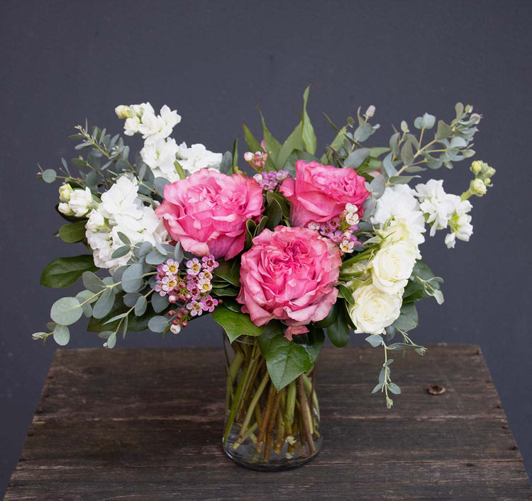 A sweet garden-style arrangement in bright pinks and whites. Includes roses, spray roses, stock and garden greens.