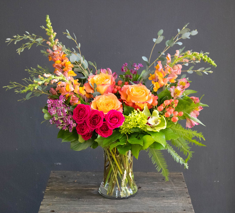 A showy, colorful garden style arrangement with snapdragons, roses, spray roses, hydrangea and and orchid bloom.