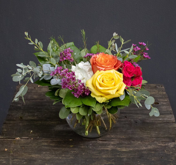 A colorful petite arrangement in a glass bubble bowl with roses, hydrangea and greenery.