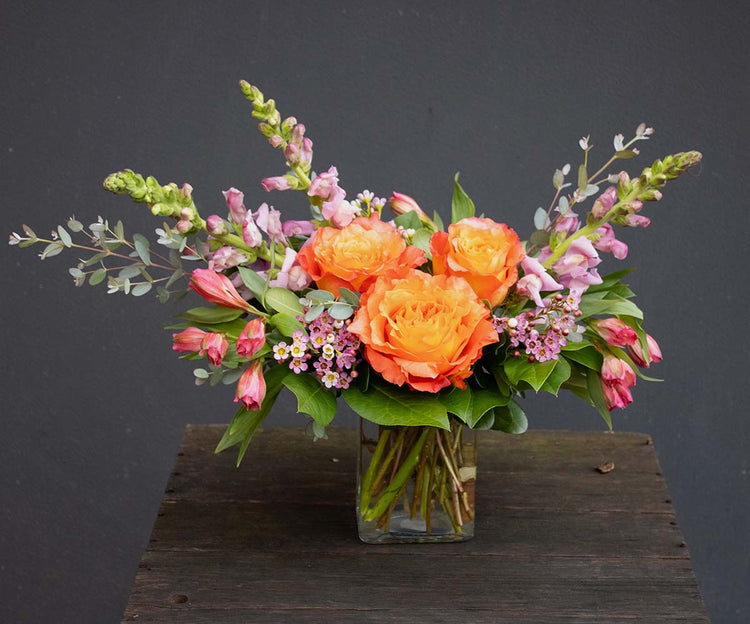 A vibrant vase arrangement of orange roses, lavender snapdragons, and flowing greens.