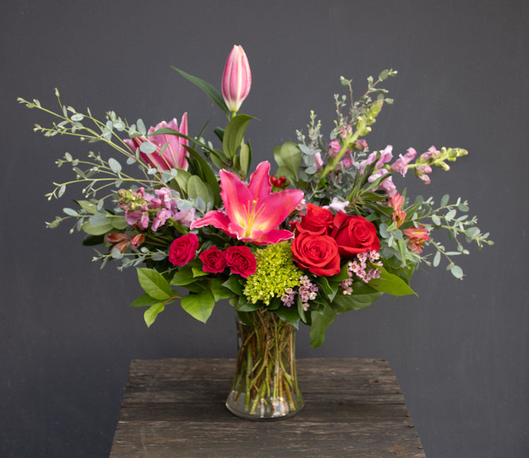 A showy, romantic arrangement with lilies, roses, spray roses, hydrangea and snapdragons.