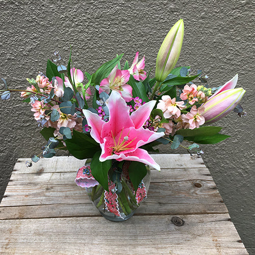 A sweet arrangement with pink lilies, stock and garden greens. Standard size shown.