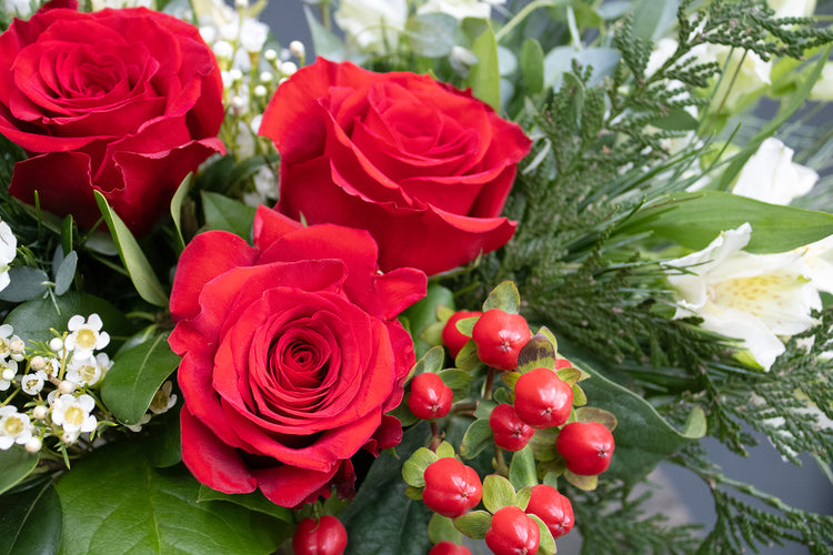 A holiday arrangement with snapdragons, roses, berries and evergreens. A perfect holiday gift.
