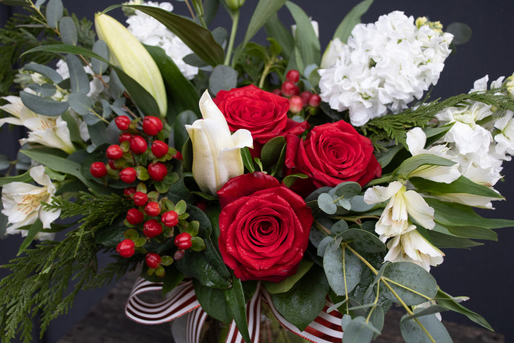 A premium, showy holiday arrangement with roses, lilies, stock, berries and holiday greens.