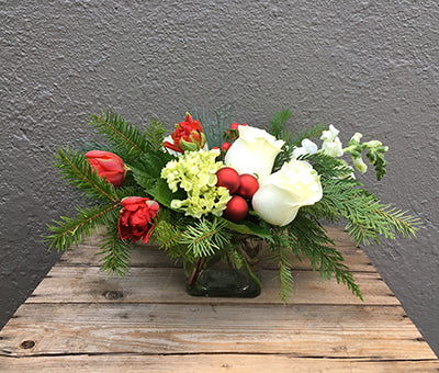 A festive holiday centerpiece with tulips, roses, hydrangea and ornaments.