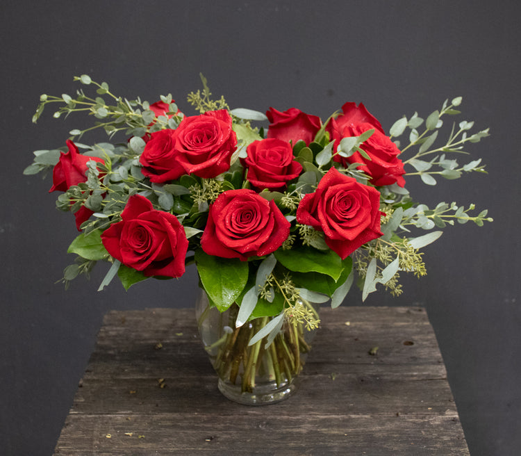 Premium red roses designed in a vase with greenery and filler.