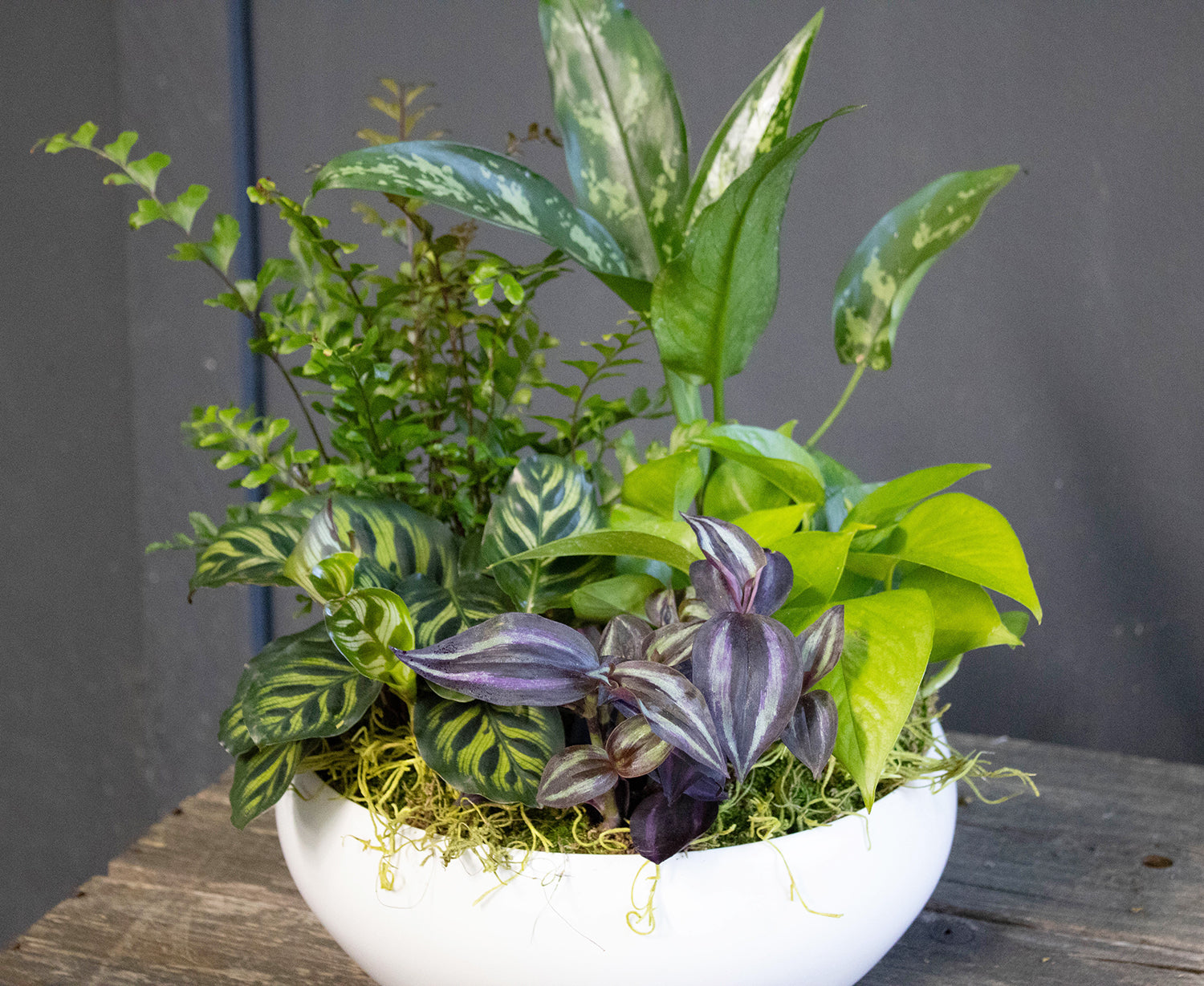 A thoughtfully curated mix of indoor houseplants with varied colors and textures finished with moss. Container may vary.