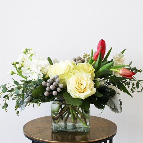 A low and lush arrangement in a glass cube with roses, tulips, stock and textured greens. Standard size shown.