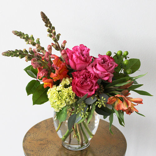 A bright and cheerful arrangement of roses, hydrangea and snapdragons.