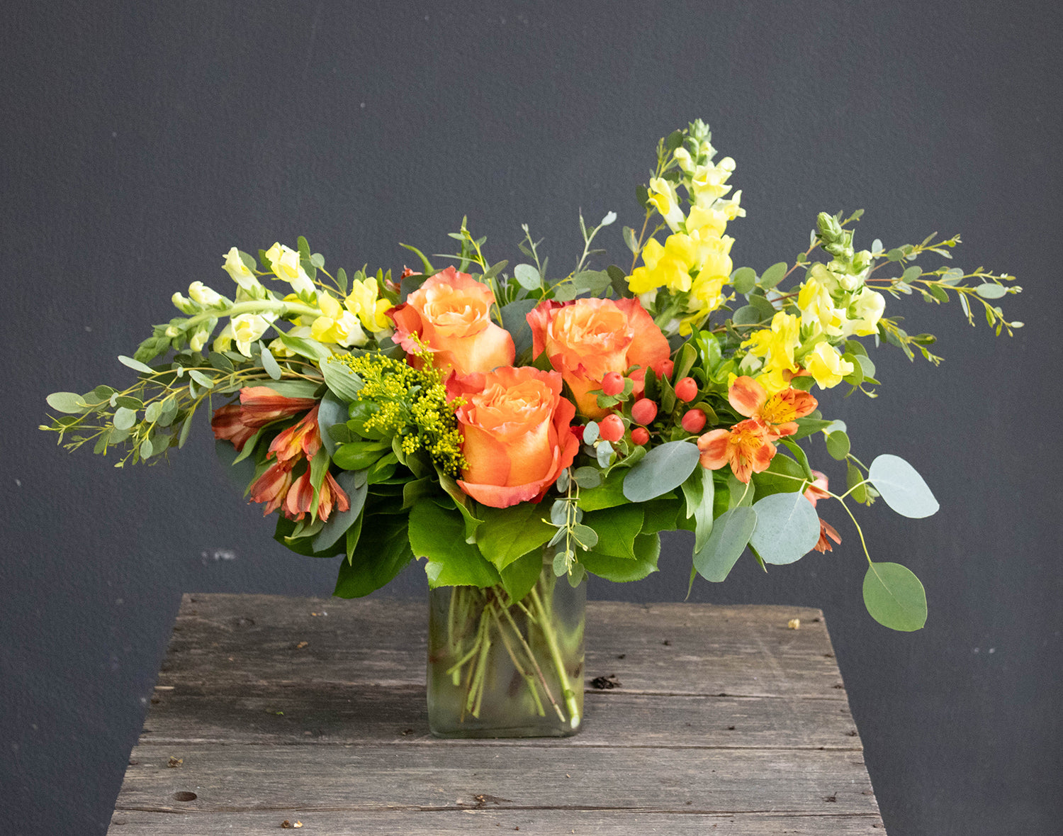 An arrangement in yellows and oranges with roses, snapdragons, alstroemeria and flowing greens.
