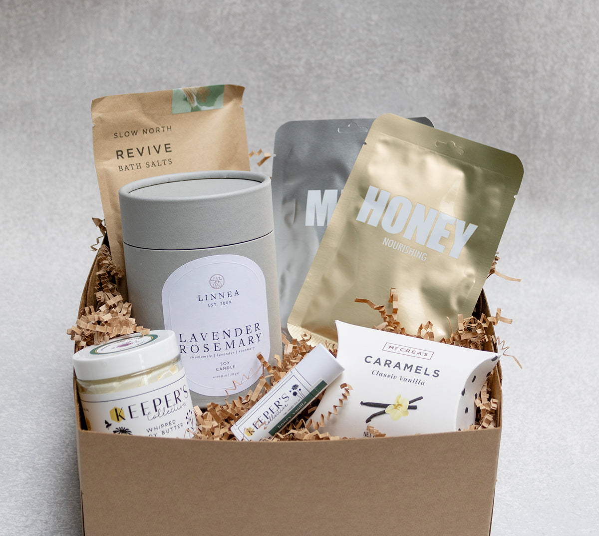 A decadent box of self-care goodies. A Lavender Rosemary Candle in a gift box, Milk and Honey sheet face masks, a bath bomb, whipped body butter and lip balm by Keepers Collective and a box of buttery honey caramels. Packaged in a gift box and tied up with a bow.