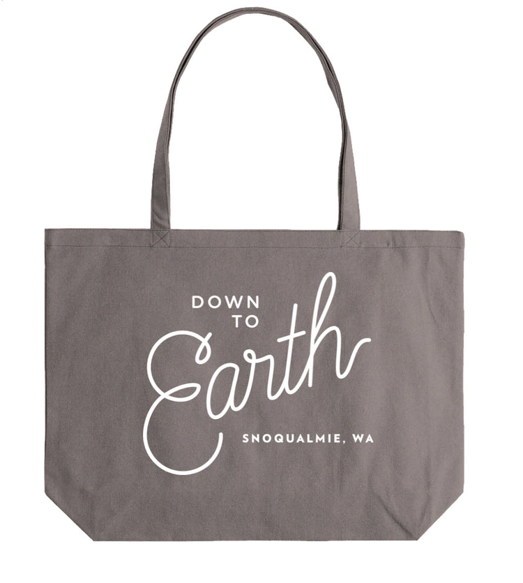 A cotton canvas reusable tote bag that shows your love for the your favorite shop in town. Use it as your daily tote or fill it with goodies for the perfect gift bag. Down to Earth, Snoqualmie, WA is printed in white on one side of this grey canvas tote.