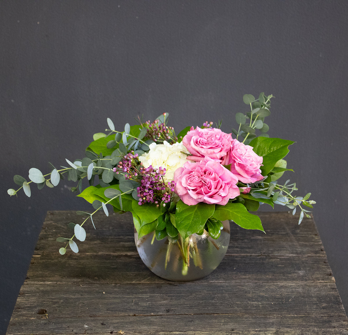 Hydrangea and roses in a bubble bowl with garden greens and accent flowers.