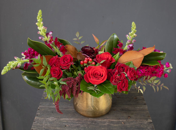 An elegant arrangement in rich reds, deep fuchsias with greenery in a gold pot - pot style may vary slightly. Flowers include roses, snapdragons, spray roses, stock and other seasonal elements to complement.