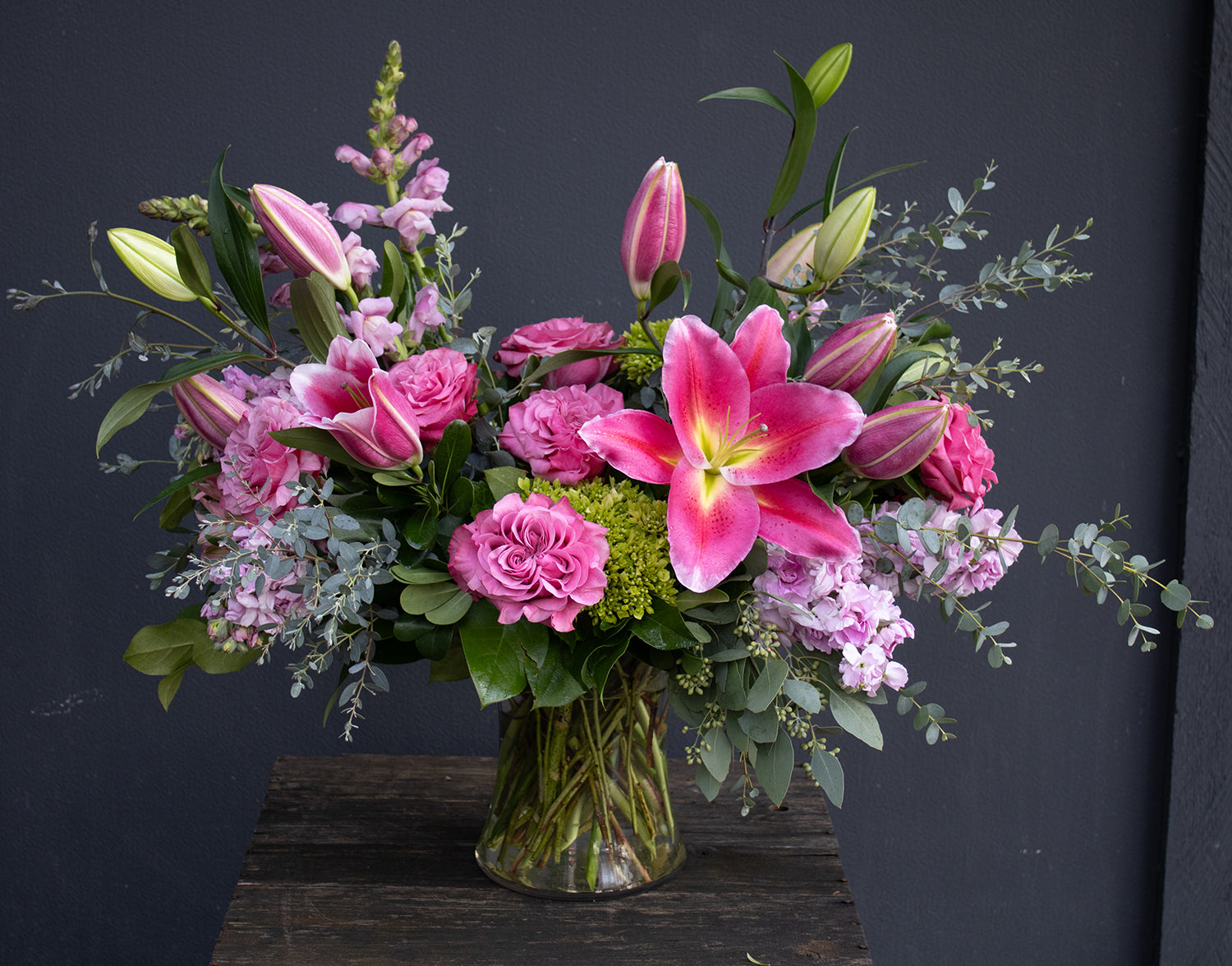 A gorgeous, showy arrangement in rich pink tones with lilies, roses, stock and hydrangea.