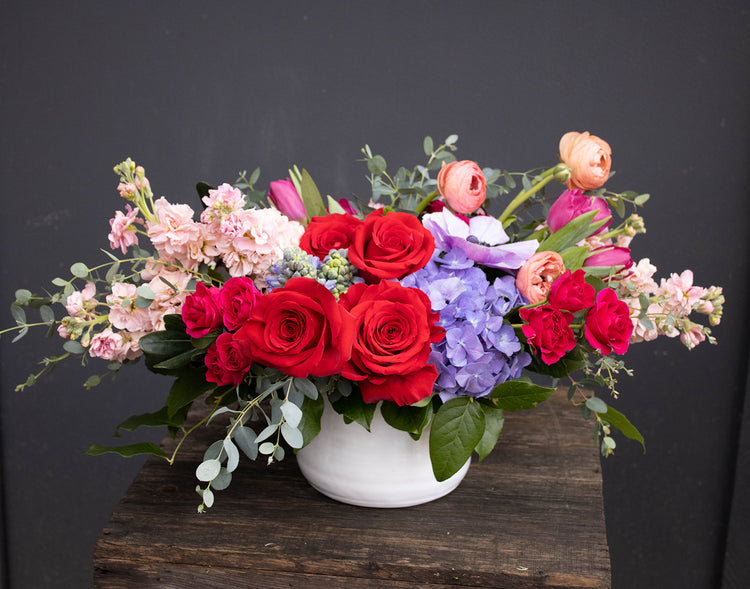 A decadent low and lush, compact arrangement with reds, purples, peaches and pinks in a white ceramic vase.