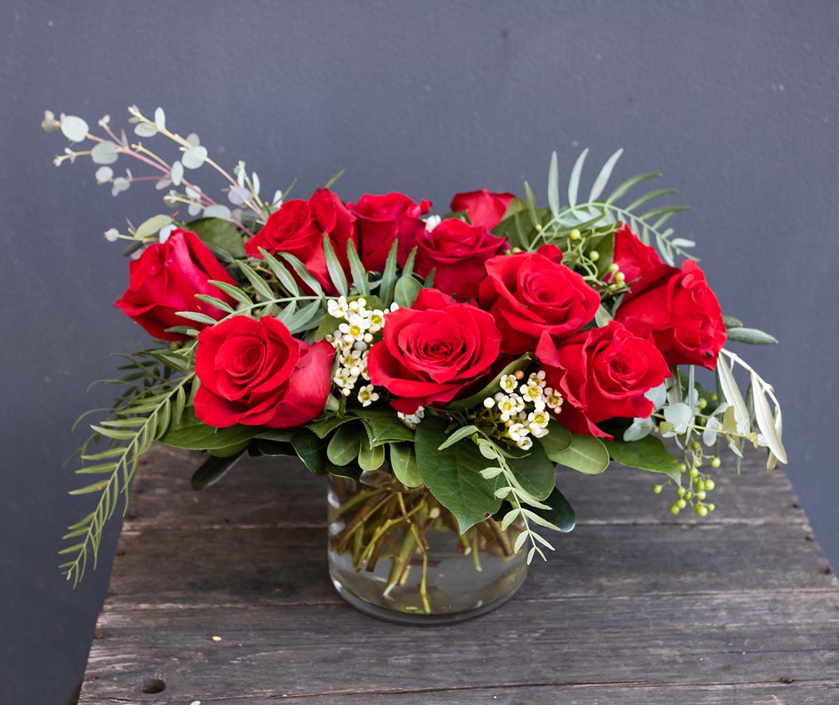 An elegant low and luxurious dozen red roses in a glass cylinder.