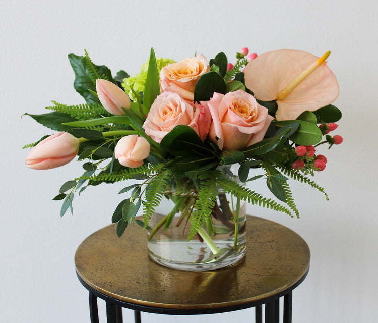 A modern arrangement of peachy blooms including roses, tulips, anthurium and hypericum berries in a glass cylinder vase. Shown at the standard size.