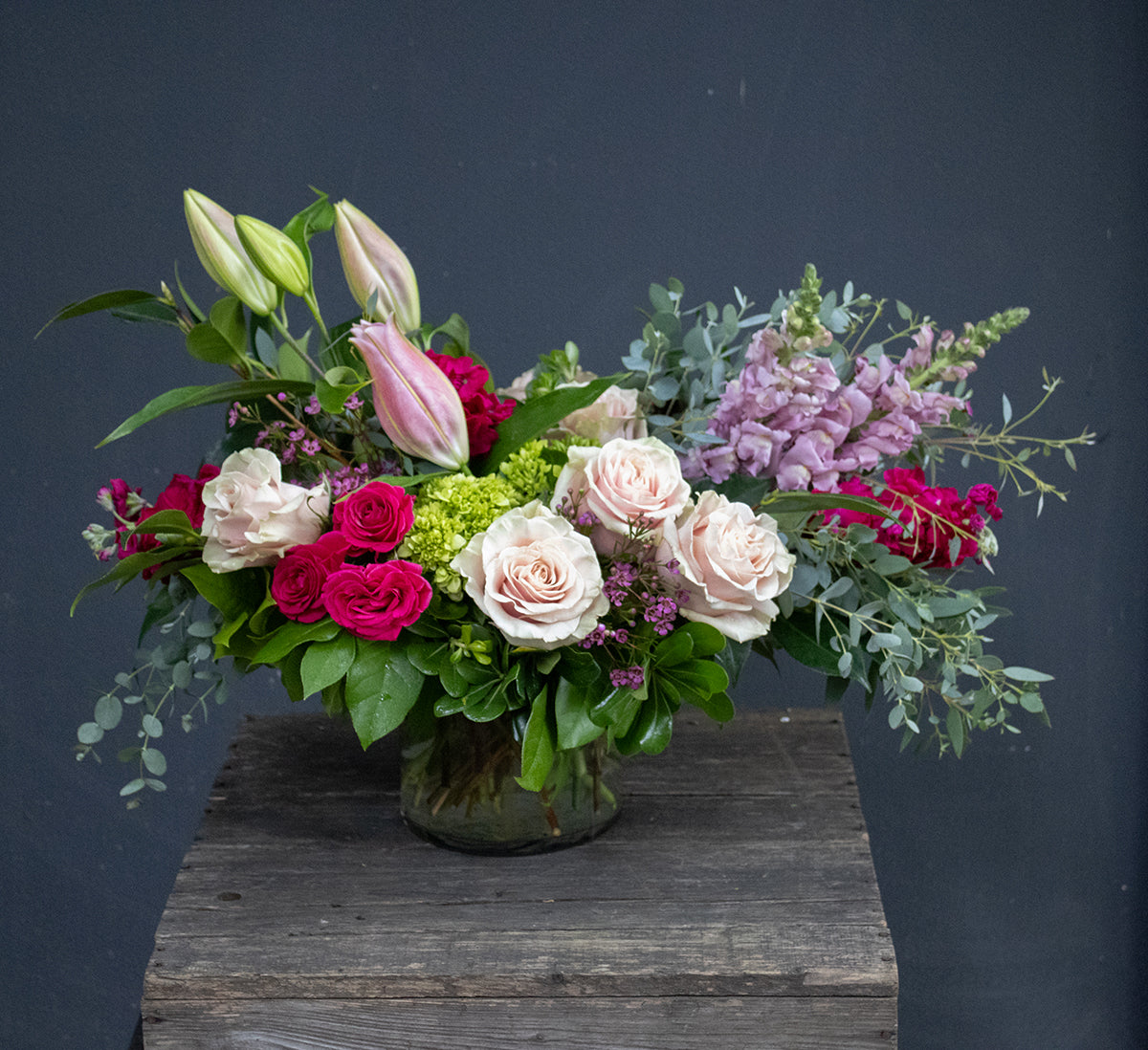 A romantic garden-inspired arrangement in pinks, lavender and greens with roses, stock, lilies with seasonal accents.