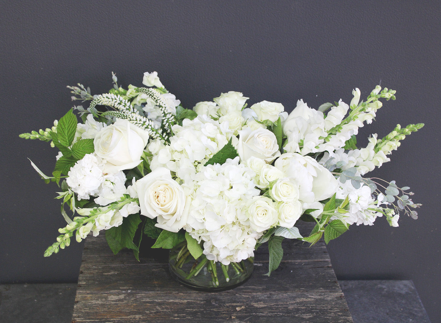 A luxurious low and lush arrangement with white seasonal blooms and garden greens.