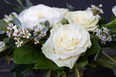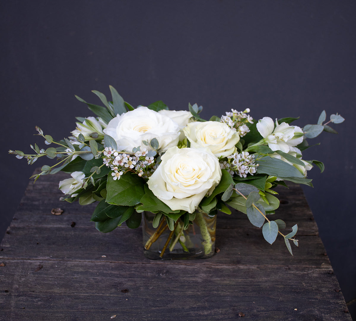 A petite centerpiece in a glass cube with white blooms and garden greens. Perfect for a dining table or coffee table.