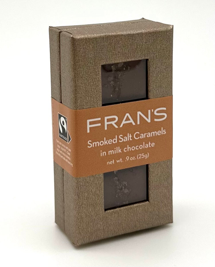 Award-winning Smoked Salt Caramels by Fran’s Chocolates in Seattle. These decadent treats feature a harmonious blend of complex flavors–rich smooth chocolate, soft, buttery caramel and the unexpected boldness of the gray and smoked sea salts.