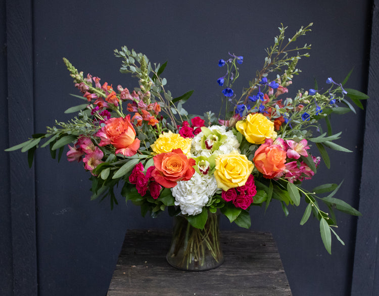 A showy, colorful garden style arrangement with snapdragons, roses, spray roses, delphinium and orchids.