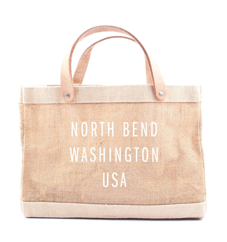 Show your love for North Bend with this petite burlap market bag that features a soft leather handles and a tough and spill-proof inner lining. Perfect for lunches, snacks or fill it with goodies for a elevated gift bag.