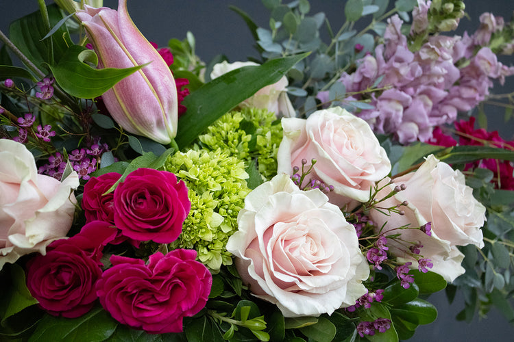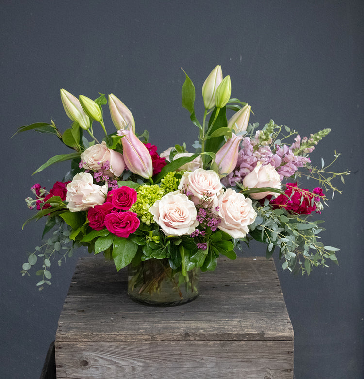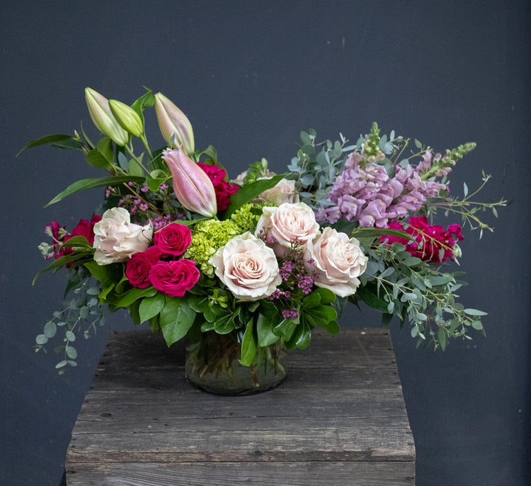 A romantic garden-inspired arrangement in pinks, lavender and greens with roses, stock, lilies with seasonal accents.