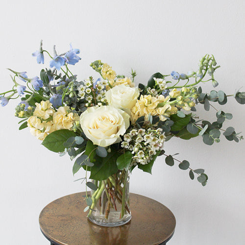 A fresh, garden-style vase arrangement in whites, creams and light blue.