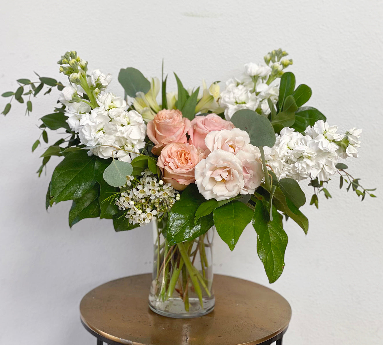 A sweet garden-style arrangement in soft peach and whites. Includes roses, spray roses, stock and garden greens.